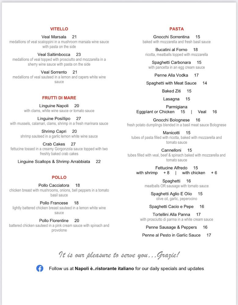 The entrees include hearty offerings, like Pollo Cacciatora and seafood selections such as Linguine Napoli. Each dish balances authentic flavors and generous portions. Pricing is ideal, with average meals ranging from $10 to $20, offering great value.
